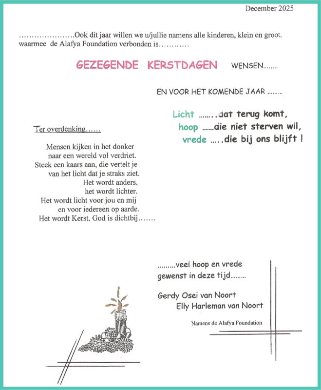 The Alafya Foundation Ghana -van het Hausa woord voor gezondheid en welzijn-, is een christelijke, niet-gouvernementele non-profit Organisatie (NGO), toegewijd aan de zorg voor kwetsbare kinderen (wezen en anderen) in de boven-oostelijke en Brong-Ahafo gebieden in Ghana. De Alafya Foundation heeft jouw hulp nodig voor het behouden van de Home Based Care programs in Bolgatanga en het nieuwe kindertehuis in Sunyani, The Kids´ Shelter.